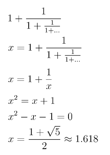 One of the most common types of patterns originates from phi (Φ). This value is equal to the first infinite fraction that we see on the right, but because it repeats infinitely, it seems almost impossible for us to be able to calculate such a value. However, a simple but creative use of algebraic substitution allows us to exploit the issue of infinite repetition and calculate our answer!